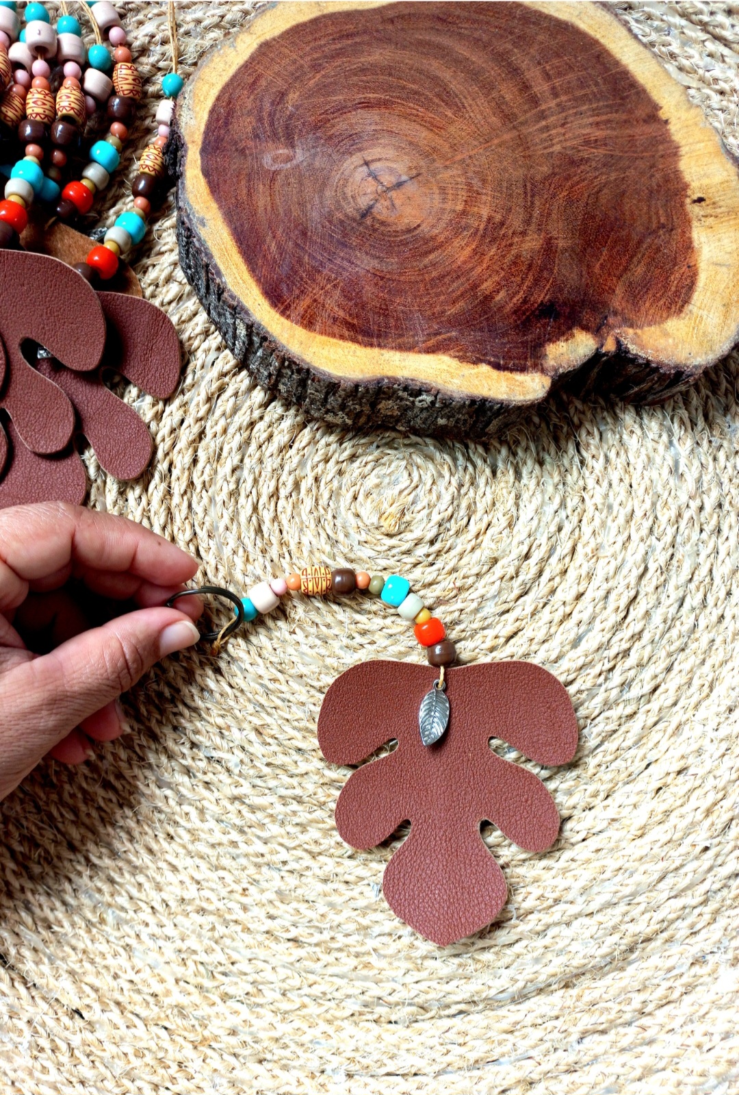 Chaveiro feito com couro ecológico e miçangas diversas.